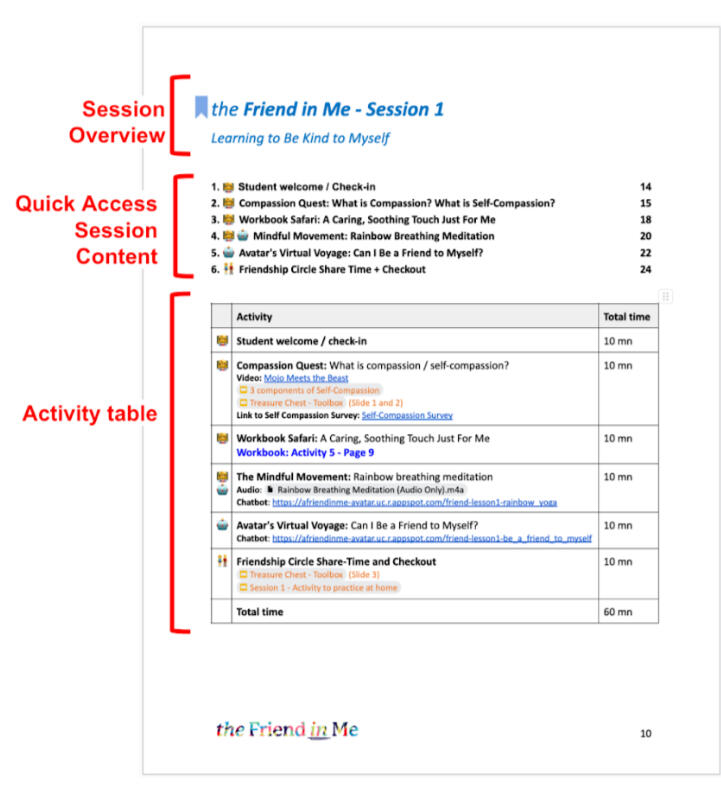 The Friend In Me Curriculum is grounded in the principles of evidence-based Mindful Self-Compassion Programs, as outlined in clinical research. It is based on the Mindful Self-Compassion Program, co-developed by Kristin Neff, Ph.D., and Chris Germer, Ph.D., and its adapted version for teens, Mindful Self-Compassion for Teens, co-developed by Lorraine Hobbs, M.A., and Karen Bluth, Ph.D. Research shows that teaching self-compassion can significantly improve emotional regulation, reduce anxiety, and enhance social connections.The curriculum is segmented into six distinct sessions. Each session is dedicated to unfolding a specific facet of self-compassion.
