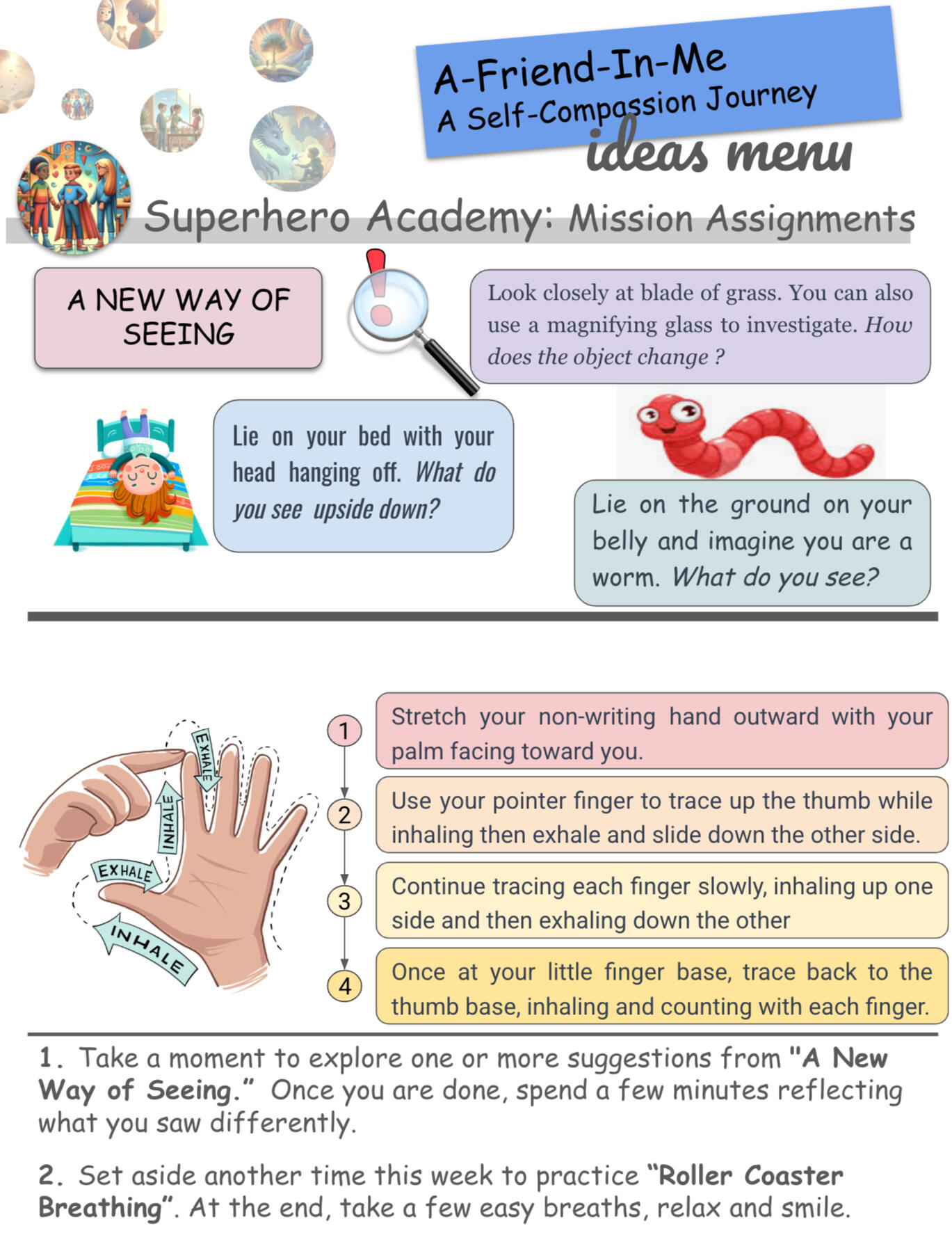 Foundational Sessions: Introduce self-kindness, mindfulness, and common humanity, helping children build a strong foundation for self-compassion through interactive activities.
