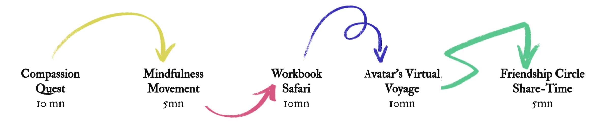Each session in The Friend In Me curriculum is thoughtfully designed to engage and empower children. Sessions start with The Compassion Quest, introducing the day’s theme through storytelling or group discussions. The Mindfulness Movement follows with gentle exercises connecting mind and body. The Workbook Safari offers hands-on activities like reflective journaling, while The Avatar’s Virtual Voyage features Sparkle guiding interactive exercises. Sessions end with The Friendship Circle Share-Time, fostering connection and reflection. This structure ensures every session is interactive, impactful, and suited to pre-teens’ developmental needs.